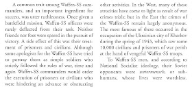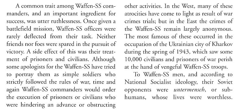 In fact, the entire last chapter of the book is no less than a lengthy apologia for the SS combat veterans, noting their differences from the Death's Head Division that was recruited en masse from concentration camp guards. Blandford believes that Waffen SS were soldiers, not murderers.
